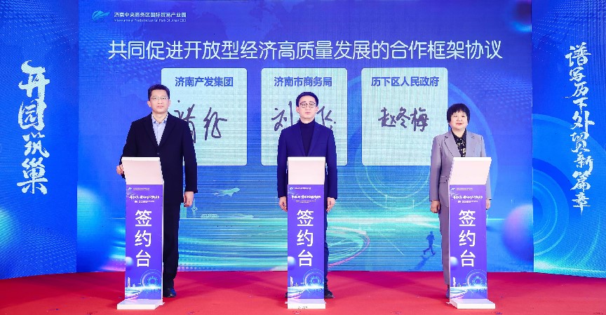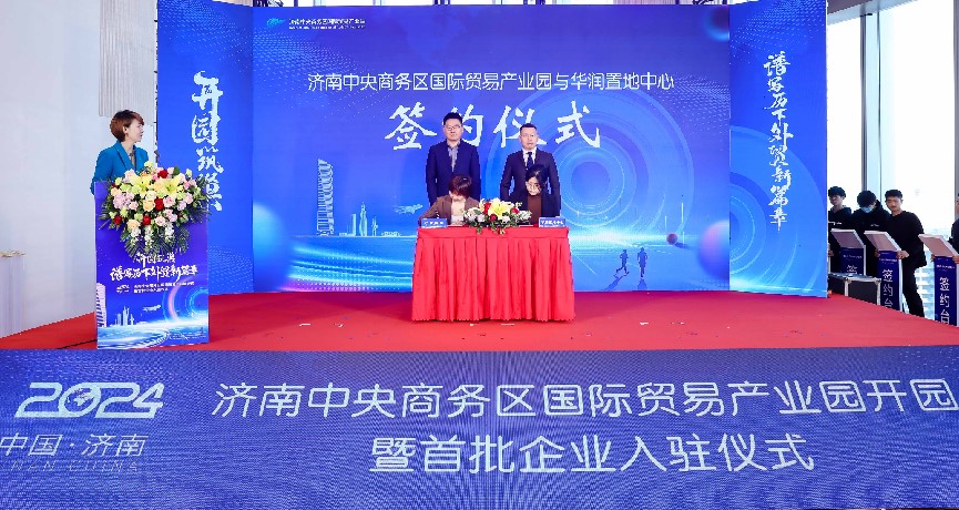 在入駐簽約環(huán)節(jié),濟(jì)南國商園區(qū)運(yùn)營管理有限公司總經(jīng)理陳蕾與華潤置地中心項(xiàng)目負(fù)責(zé)人李靜宜簽訂了委托運(yùn)營協(xié)議;劉燕飛、趙冬梅、褚征分別代表濟(jì)南市商務(wù)局、濟(jì)南市歷下區(qū)人民政府、濟(jì)南產(chǎn)發(fā)集團(tuán)共同簽署《共同促進(jìn)開放型經(jīng)濟(jì)高質(zhì)量發(fā)展合作框架協(xié)議書》;王紅、楊傳軍、趙治文、楊福濤、王海清、黃蓓、邵丹丹共同按下啟動(dòng)開園按鈕,宣告濟(jì)南中央商務(wù)區(qū)國際貿(mào)易產(chǎn)業(yè)園正式開園。